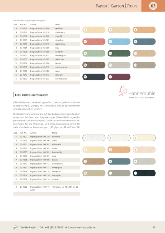 Echt-Bütten Bugrapapier, Artikelnummern: 03-1500, 03-1510, 03-1502, 03-1503, 03-1519, 03-1505, 03-1508, 03-1512, 03-1507, 03-1504, 03-1517, 03-1506, 03-1513, 03-1522, Artikel: Bugrabütten 103 300 Bugrabütten 103 310 Bugrabütten 103 302 Bugrabütten 103 303 Bugrabütten 103 319 Bugrabütten 103 305 Bugrabütten 103 308 Bugrabütten 103 312 Bugrabütten 103 307 Bugrabütten 103 304 Bugrabütten 103 317 Bugrabütten 103 306 Bugrabütten 103 313 Bugrabütten 103 322 Notiz gelblich altdeutsch altgold ziegelrot saphirblau blau hellgrün dunkelgrün rehbraun braun marmorgrau grau schwarz bordeauxrot Echt-Bütten Ingrespapier, Oberfläche matt, säurefrei, gepuffert, neutral geleimt und alterungsbeständig. Gerippt, mit vierseitigen, echten Büttenrändern und Wasserzeichen ,,Hahn". Die Bezeichnung geht zurück auf den bedeutenden französischen Maler und Zeichner Jean Auguste Ingres (17801867). Ingres-Papiere eignen sich hervorragend für die unterschiedlichsten Drucktechniken, für die Umschlag- und Einbandgestaltung sowie für viele künstlerische Anwendungen. 100 g/qm, ca. 48 x 62,5 cm BB. Artikel: 03-1622 Ingresbütten 100 130 hellweiß, 03-1600 Ingresbütten 100 100 weiß, 03-1601 Ingresbütten 100 101 elfenbein, 03-1602 Ingresbütten 100 102 antik, 03-1603 Ingresbütten 100 103 kornfarbig, 03-1607 Ingresbütten 100 107 rosa, 03-1608 Ingresbütten 100 108 braun, 03-1612 Ingresbütten 100 112 dunkelblau, 03-1617 Ingresbütten 100 117 mittelgrau, 03-1618 Ingresbütten 100 118 sandgrau, 03-1610 Ingresbütten 100 110 mausgrau, 03-1614 Ingresbütten 100 114 schwarz, 03-1620 Ingresbütten 100 119 150 g/qm, ca. 78 x 104 cm BB weiß, Büttenvorsatz von Hahnemühle We-Ha-Papier,