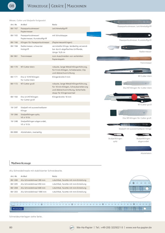 Werkzeuge | Geräte | Maschinen, 08-1167, 08-1165, 08-1166, 08-1184, 08-1061 Passepartoutmesser/ Papiermesser, Kunststoffgriff Klingen für Passepartoutmesser Radiermesser, schwarzer Holzgriff Trennmesser, Leichtmetallgriff mit Schutzkappe (Papiermesserklingen) vernickelte Klinge, beidseitig verwendbar durch abgeflachtes Griffende, Länge 16,8 cm zum Ausschneiden von verleimten Papierstapeln 08-1170 NT-Cutter klein, 08-1171, 08-1172 Etui à 10 NT-Klingen für Cutter klein NT-Cutter groß, 08-1183 Etui à 6 NT-Klingen für Cutter, groß robuste, lange Metall-Klingenführung, für 9 mm-Klingen, Schieberaster, Clip und Abbrechvorrichtung Klingenbreite 9 mm robuste, lange Metall-Klingenführung, für 18 mm-Klingen, Schraubarretierung und Abbrechvorrichtung, Sicherheitsstopp für Klingenwechsel Klingenbreite 18 mm 18-1247, 18-1266, 18-1248 Skalpell mit auswechselbarer Klinge Skalpellklingen spitz, VE à 10 St. Skalpellklingen abgerundet, VE à 10 St. 08-3000 Abziehstein, zweiseitig Maßwerkzeuge Alu-Schneidelineale mit stabilisierter Schneideseite. Art.-Nr. 08-1200, 08-1205, 08-1204, 08-1203 Alu-Schneidelineal 300 mm, Alu-Schneidelineal 450 mm, Alu-Schneidelineal 600 mm, Alu-Schneidelineal 1000 mm, rutschfest, Facette mit mm-Einteilung, Schneideunterlagen, We-Ha-Papier